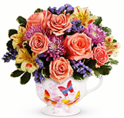 Playful and sweet just like mom, this brilliant bouquet of peach roses, yellow alstroemeria, and lavender chrysanthemums will make every mom’s heart flutter with happiness. This 2-in-1 gift also serves as a darling oversized keepsake mug (FDA-approved and food safe) adorned with dancing watercolor-hued butterflies for long-lasting enjoyment.